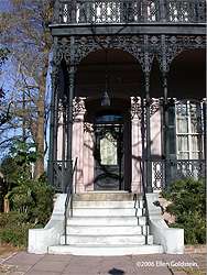 We arrived in New Orleans late, around 10:30…too late to get into the Acme Oyster Bar. Settling for passable Cajun food with windows out onto Bourbon Street, we happened to see a segment being videotaped for "America’s Most Wanted." The next day was my birthday, so we planned a day filled with highlights. First was an obligatory stop at the Café Du Monde for chicory coffee and beignets, followed by a drive out to the Garden District with its fine old houses. Soon we located the distinctively turquoise-and-white striped awnings of the Commander’s Palace Restaurant, where we were served one of the most extravagant lunches we have ever consumed…turtle soup, an artistically-arranged catfish salad, and bread pudding souffle. We walked off the lunch around the Garden District in sub-freezing weather, admiring the gothic ironwork and stately presence of the grand and imposing mansions…inspiring me to get out my blank book for a sketch from the cozy confines of the car.